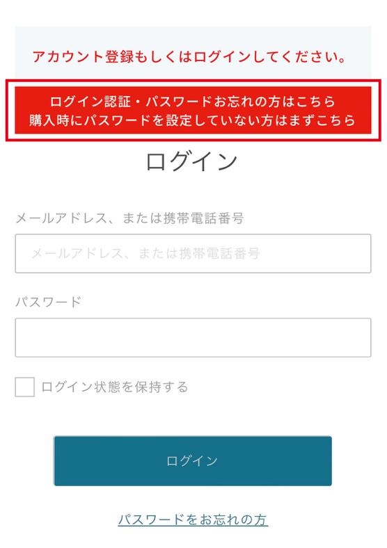 ※新規購入時にメールアドレスを入力せずご購入いただいた場合は、携帯番号がログインIDです。