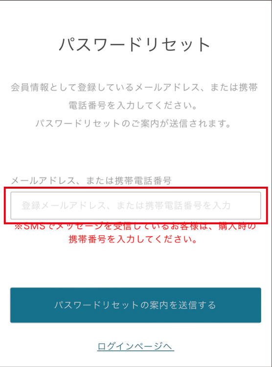 ※新規購入時にメールアドレスを入力せずご購入いただいた場合は、携帯番号を入力してください。