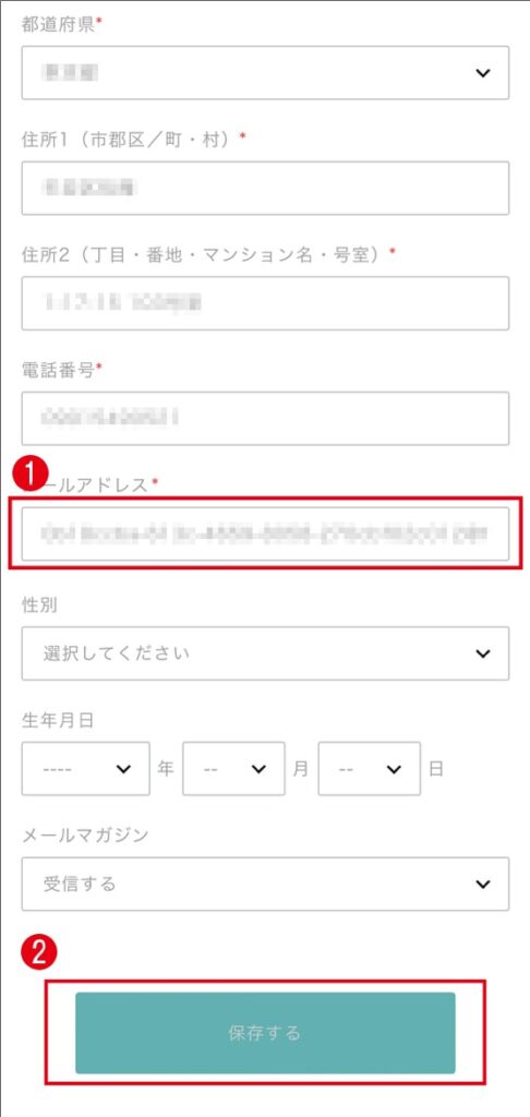 ❶メールアドレスの項目が、ランダムな変数を使用した仮メールアドレスで登録されている場合、お客様が実際に受信可能なメールアドレスを上書き入力してください。